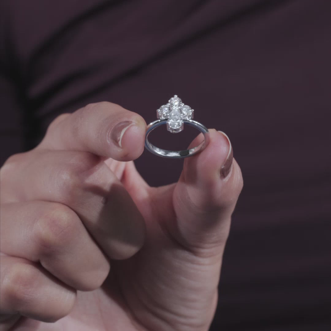 Complementing the center stone are 1.20 CT of round-cut VVS Lab Grown side stones, arranged to enhance the ring’s radiance and create a balanced, luxurious aesthetic. The combination of pear and round cuts brings together classic elegance and contemporary brilliance, making this ring a striking choice for modern brides.